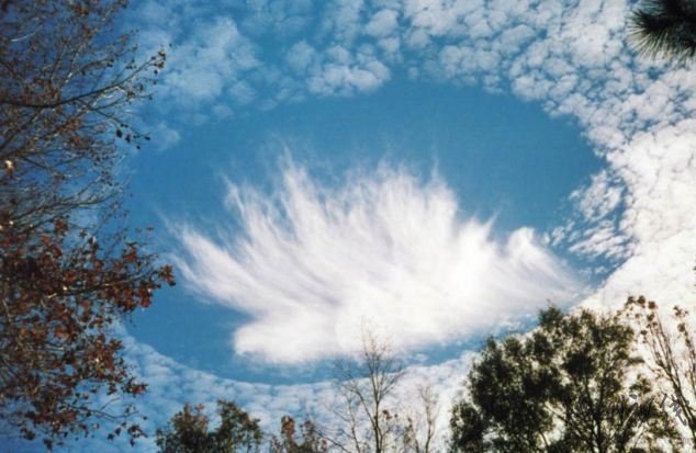 研究表明,某些特定高度的高空云層中包含了冰晶體和低于攝氏0度卻仍處于液態(tài)的過冷水滴。飛機穿過這樣的云層時會使過冷水滴迅速冷卻下落變成雪花,在云層中形成一個圓洞。科研人員目前已經(jīng)把多次降雪和附近飛過的航班聯(lián)系起來。