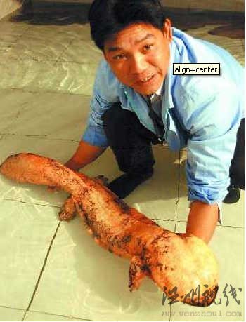 溫州在線動物世界訊,江西井岡山長古嶺水溪里意外捕獲到一條黃金娃娃魚,現身長有兩尺左右,重約1.5公斤。這在江西省還是首次發現,全國也是極其罕見。娃娃魚一般都是黑色或褐色的,黃金娃娃魚可能是因為基因突變,所以出現的概率非常低。