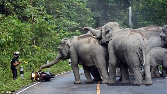 摩托遭大象圍攻:哥們雙手合十,應(yīng)該是在祈禱