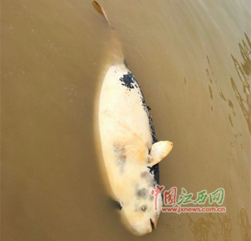 9月27日,鄱陽湖都昌水域發現一頭死亡江豚,身體已脫皮。