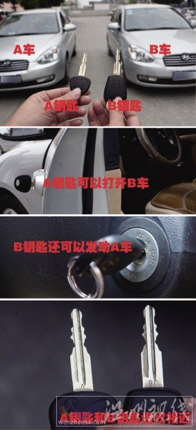 第二天,黃女士通過交警聯系到該車車主張先生,張先生的公司就設在萬盛大廈。兩人一碰頭,才知道張先生這輛車是今年從北京現代溫州奧奔4S店買來的,這車與黃女士的車唯一不同的是,它是自動擋。兩人之后又做了試驗,黃女士發現自己的車鑰匙可以打開張先生轎車的車門和后備箱,張先生的車鑰匙除了可以打開她的轎車車門和后備箱,還能發動她的車子。