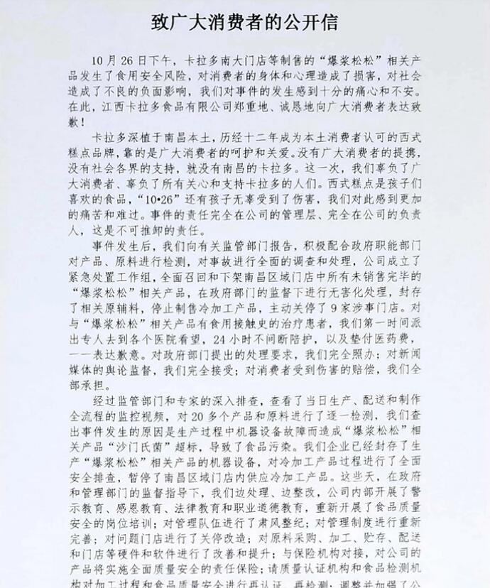 10月30日晚,江西卡拉多食品有限公司發(fā)布致消費(fèi)者的公開信,經(jīng)過監(jiān)管部門和專家的深入調(diào)查,查出事件發(fā)生原因系生產(chǎn)過程中機(jī)器設(shè)備故障而造成“爆漿松松”相關(guān)產(chǎn)品“沙門氏菌”超標(biāo),導(dǎo)致食品污染。目前卡拉多食品已封存生產(chǎn)“爆漿松松”相關(guān)產(chǎn)品的機(jī)器設(shè)備,對(duì)冷加工產(chǎn)品過程進(jìn)行全面安全排查,暫停南昌區(qū)域門店內(nèi)供應(yīng)冷加工產(chǎn)品。