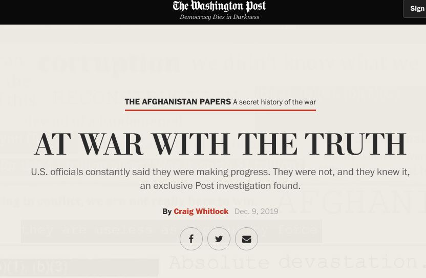 美國戰爭機密文件:2019年12月9日,《華盛頓郵報》發布題為“關于戰爭真相”的長篇報道,他們獲取了2000頁的政府機密文件,披露美國政府在阿富汗戰爭問題上長期誤導公眾,隱瞞戰爭已無法取勝的事實。