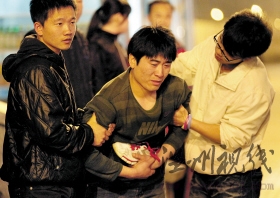 “司機就是從這里離開的。”目擊者指著風(fēng)擋玻璃處。記者看到,在車頭前方的地上,出現(xiàn)一些血點,“司機走的時候,頭部也受了傷。”目擊者說。據(jù)了解,事發(fā)時,大貨車內(nèi)只有司機一人。