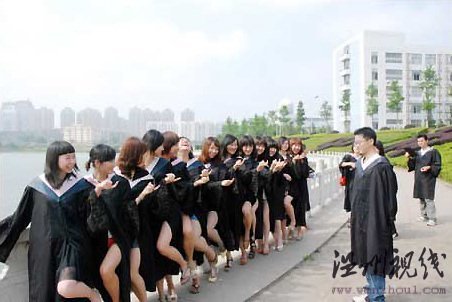 昨日下午,國內(nèi)著名網(wǎng)絡(luò)論壇上一則《班上MM們的瘋狂露腿畢業(yè)照》帖子,引起網(wǎng)友們關(guān)注,點擊率1小時高達(dá)2000多次。照片里,十多名女生穿著學(xué)士服在一個湖邊拍照,都側(cè)身露出大腿、面帶笑容,前面一個同樣穿學(xué)士服的男生在看她們擺姿勢。
