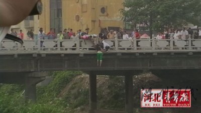 忽然,女子身子倒向橋下,千鈞一發之際,民警迅速撲上前,一把抓住了該女子的右胳膊。該女子極力扭動身軀想掙脫。