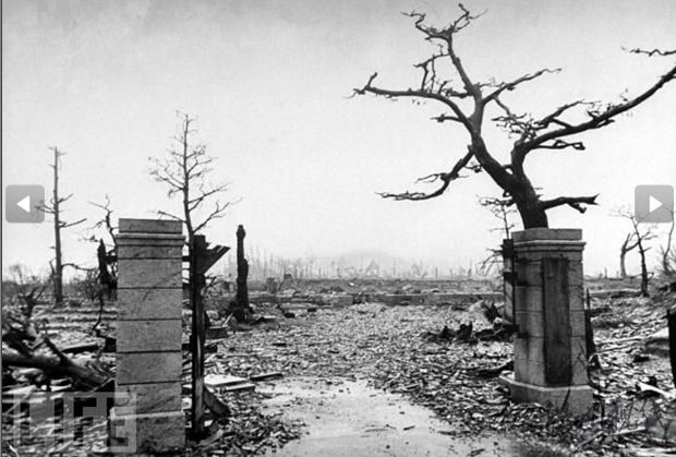 | 廣島成了廢墟,建筑物全被夷為平地,草木皆死。 |