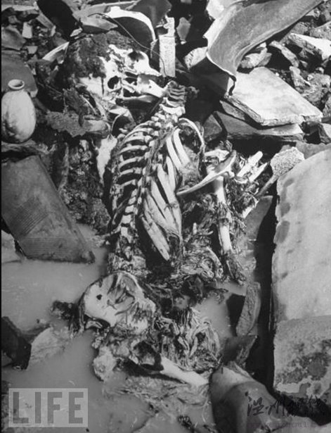 | 原子彈爆炸瞬間,人體肌肉和皮膚瞬間蒸發消失,只留下殘缺不齊的骨骸。 |