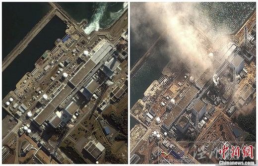 3月14日,日本東京電力公司福島第一核電站3號機組當地時間上午11點過后發生氫氣爆炸。NHK電視臺畫面顯示福島第一核電站爆炸前(下)后(上)對比圖。