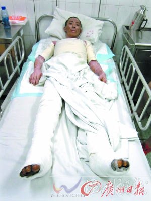 何勇的身體也因此完全暴露在記者眼里——除去被紗布緊緊包裹的上半身和雙腿,他的雙臂、后腦勺已脫了一層皮,結(jié)了痂。露出的腳趾已幾乎完全變黑,左耳郭因燙傷已部分缺失。