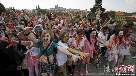 近日,在捷克首都布拉格,人們裝扮成僵尸的樣子參加一場(chǎng)“僵尸大游行”。