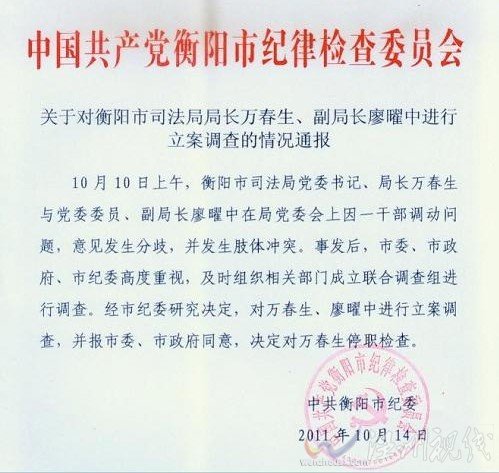 新聞回顧:湖南衡陽司法局局長萬春生與副局長廖曜中因人事安排在黨委會互毆