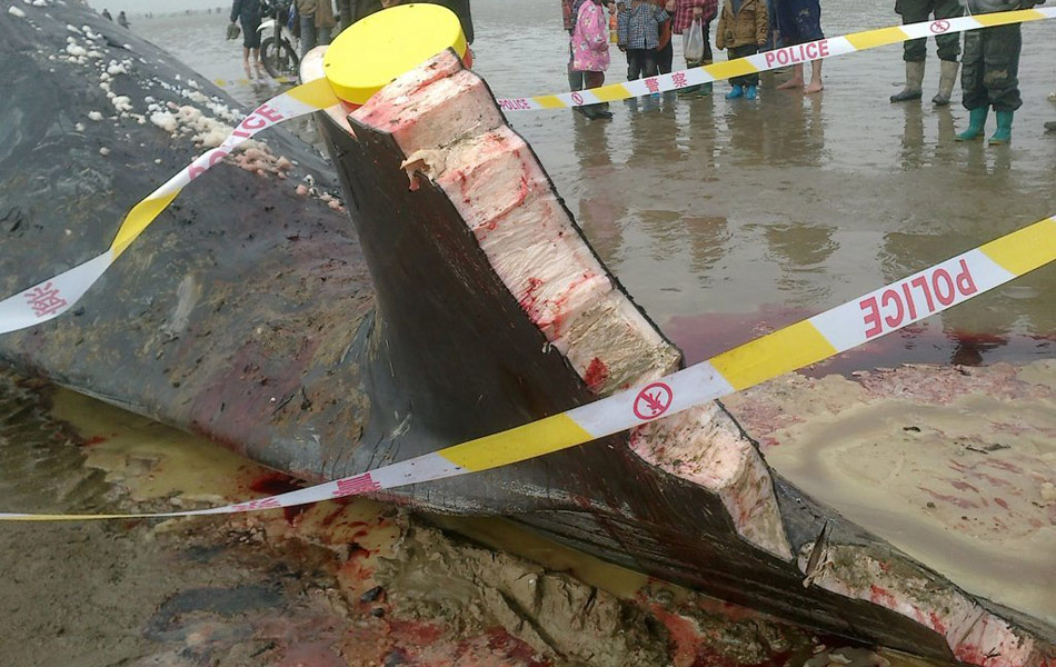 江蘇鹽城鯨魚遭割肉 市民圍觀被割肉的抹香鯨(組圖)