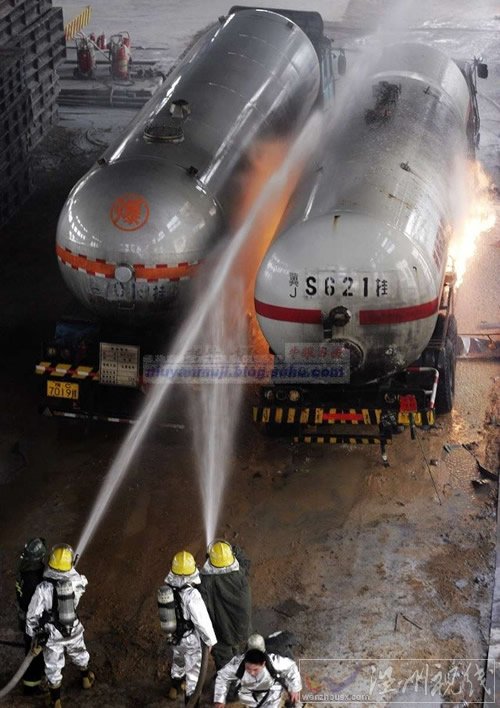 湖南懷化爆炸相關:洛陽兩輛液化氣罐車著火,消防員冒死營救。