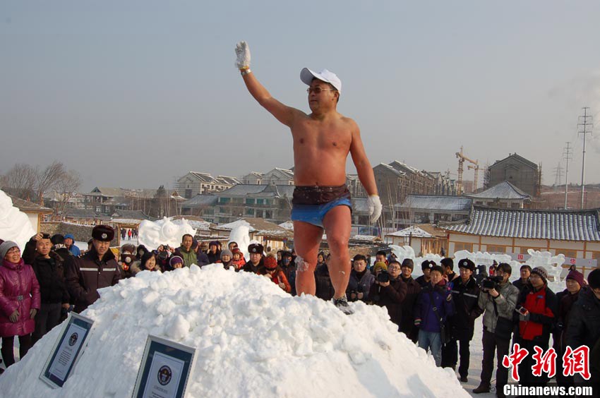 2013年1月13日上午,在延吉阿里郎冰雪節上,“世界冰王”金松浩表演耐寒絕技,令圍觀者驚嘆不已。金松浩不僅埋在齊腰深的雪坑中作畫、唱歌,零下18℃的環境在冰面上用60桶冰水沖浴。“世界冰王”金松浩極強的抗寒能力,真是奇人呀!