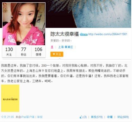 "陳太太很幸福"微博吹牛遭人肉搜索:你可以說上海天氣不好,可以說上海交通擁堵,但不能侮辱上海人。