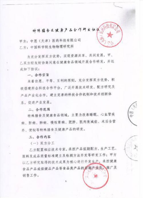 澎湃新聞記者看到的這份中科院生物物理研究所和中恩醫藥簽署的《特殊膳食及健康產品合作研發協議》中,雙方的合作范圍是“特殊膳食及健康領域,主要為改善睡眠、心血管疾病、肝病、肺病、慢性腎病、肥胖、肌肉衰減癥、術后全營養、便秘等特殊膳食及健康產品的研發”。