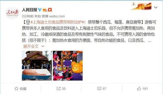 據了解,上海迪士尼新規規定游客可攜帶供本人食用的食品及飲料進入上海迪士尼樂園,但不允許攜帶需加熱、再加熱、加工、冷藏或保溫的食品及帶有刺激性氣味的食品。不可攜帶入園的食物包括(但不限于):需加熱水食用的方便面、帶自熱功能的食品,以及西瓜(需要用刀切開的一整個西瓜)、榴蓮、臭豆腐等食品。