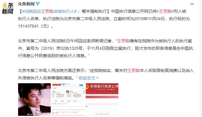人民法院報在微博辟謠表示:“經核實,王思聰確有在北京市第二中級人民法院作為被執行人的執行案件,于11月4日立案執行,但暫未對王思聰本人采取限制高消費以及納入失信被執行人名單等強制措施。故王思聰僅為被執行人而非失信被執行人”。