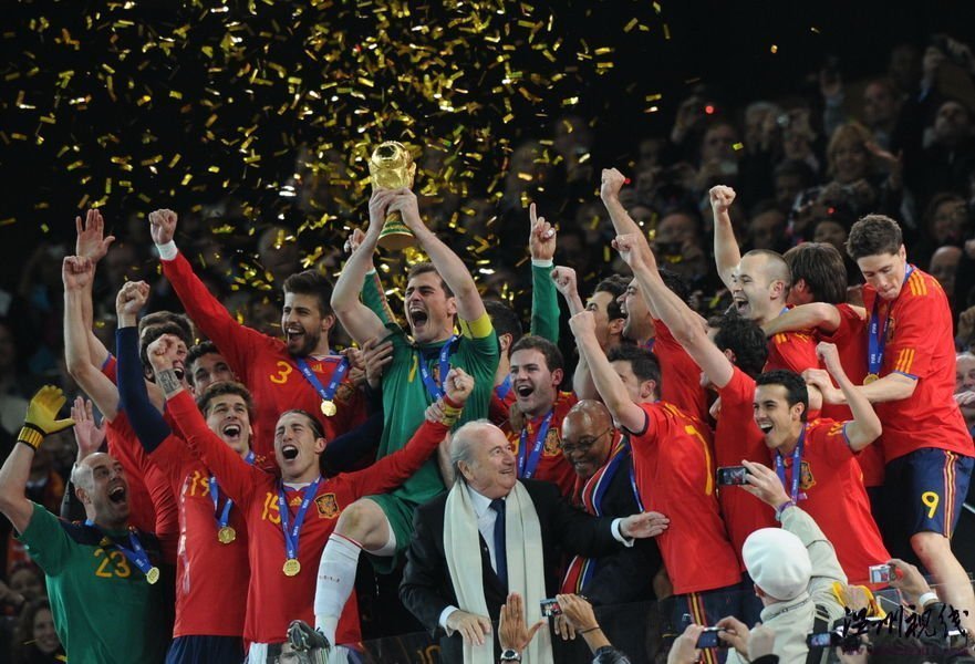 經(jīng)過120分鐘的苦戰(zhàn),西班牙終于在最后時(shí)刻絕殺荷蘭,成為歷史上第八個(gè)贏得世界杯冠軍的國家。作為隊(duì)長(zhǎng),卡西利亞斯從國際足聯(lián)主席布拉特和南非總統(tǒng)祖瑪?shù)氖种薪舆^了大力神杯,在全世界的注視中將它高高舉起。今夜注定無眠,而動(dòng)情的圣卡西也再一次成為了斗牛士們的守護(hù)神,正是他的關(guān)鍵撲救兩次阻擋了羅本的單刀。