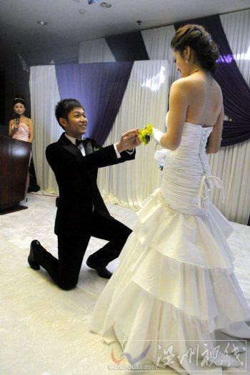 7點(diǎn),在現(xiàn)場(chǎng)近千人的祝福聲中,陳鄭潔挽著朱啟南走近宴會(huì)現(xiàn)場(chǎng),訂婚儀式開始,單膝下跪求婚、一同品嘗巧克力、切蛋糕、倒香檳、喝交杯酒、香吻……這位號(hào)稱“神奇小子”的射擊奧運(yùn)冠軍的訂婚儀式每一個(gè)環(huán)節(jié)都很浪漫。一位工作人員告訴記者,朱啟南的求婚鉆戒是3克拉。