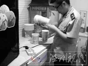 昨天中午,根據記者反映的情況,鹿城區江濱工商所工作人員來到新時代電影大世界一樓“時光咖啡”爆米花銷售點,扣留了該店830個同一廠家生產的爆米花桶,并約談了該店負責人。