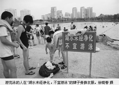 昨天下午5點(diǎn)30分,記者在楊府山公園人工湖看到,湖邊雖然設(shè)有“禁止戲水”和“湖水未經(jīng)凈化不宜游泳”等標(biāo)牌,但湖里已有數(shù)十位家長帶著孩子戲水。