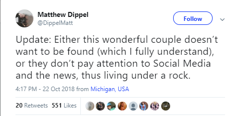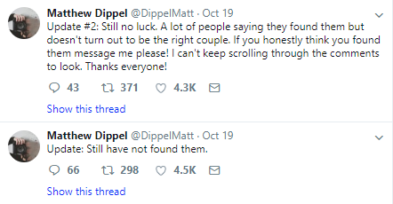 博主19號在推特上表示,雖然他收到了很多私信聲稱找到了這對情侶,但結果都不是真的。不過,博主一直沒有放棄尋找兩位主人公,表示會一直關注網友們的私信和評論,并隨時更新進展。22號,他再次發推稱,關于這兩人的身份仍一無所獲,他猜測他們可能不太經常使用社交媒體。