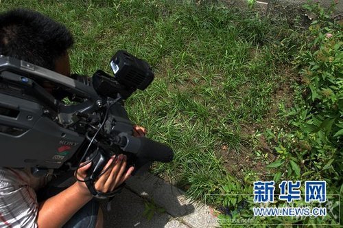 這是吳菊萍接住女童后摔倒的草叢處,巨大的沖力使現場出現兩個小坑(7月3日攝)。