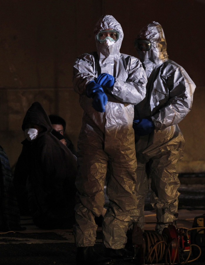 3月13日,日本福島郡山市,工作人員身著防護服。3.11地震,日本福島核電站爆炸,日本核電站機組爆炸190人受輻射。