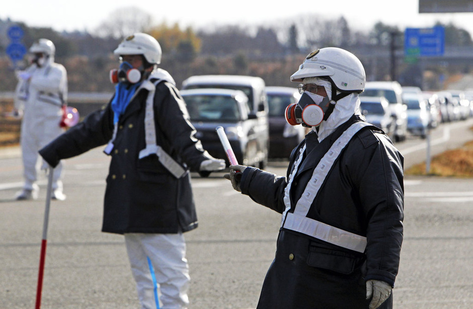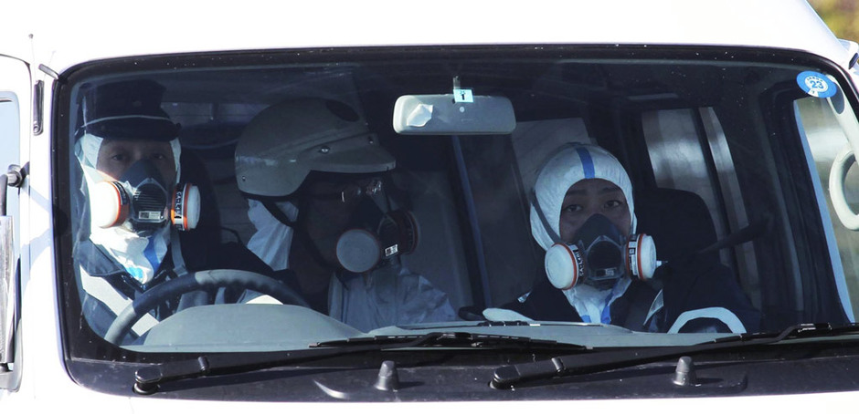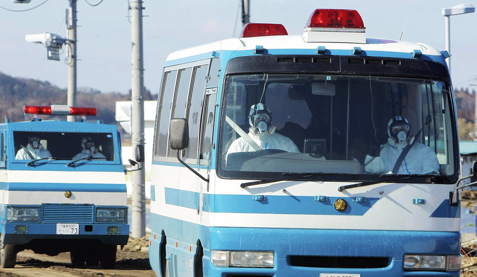 3月12日,日本福島核電站附近,日本警方身著防護服在進行巡邏警戒。3.11地震,日本福島核電站爆炸,日本核電站機組爆炸190人受輻射。