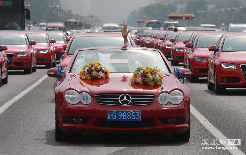 長安街最牛婚車隊(duì):35輛紅色奧迪A4車隊(duì)浩浩蕩蕩駛過長安街,2011年7月10日,北京,35輛奧迪A4和奔馳、寶馬組成的結(jié)婚車隊(duì)行駛在長安街上。這支車隊(duì)正是奧迪A4車友會(huì)成員為會(huì)長的大婚送上的一份大禮。