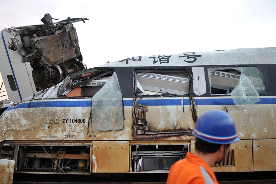 杭州到溫州動車脫軌事故現場搜救工作結束進行清理動車殘骸