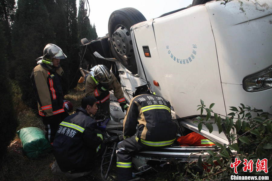 10月7日中午青銀高速淄博段發(fā)生一起客車(chē)翻車(chē)事故,車(chē)禍導(dǎo)致13人死亡,9人重傷。據(jù)青銀高速公路淄博交警大隊(duì)大隊(duì)長(zhǎng)王紀(jì)國(guó)介紹,7日11點(diǎn)44分左右,牌照魯A96925大客車(chē)自東向西沿青銀高速行駛,至銀川方向228KM+530M處時(shí),與一輛轎車(chē)發(fā)生刮擦后,從銀川方向穿越中央活動(dòng)護(hù)欄,駛?cè)雽?duì)向車(chē)道,與濟(jì)南旅順旅游汽車(chē)有限公司的魯A18526號(hào)大客車(chē)發(fā)生碰撞,致使后者翻入高速公路邊溝。車(chē)禍造成6人當(dāng)場(chǎng)死亡,7人搶救無(wú)效死亡,9人重傷。