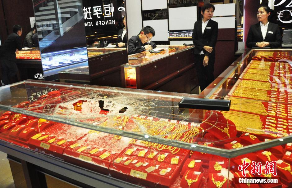 金店遭搶劫:4月25日晚7點50分左右,蘇州木瀆鎮翠坊街恒孚銀樓遭遇搶劫。一名劫匪頭戴帽子和口罩手持小鐵錘直接闖入店內,迅速砸碎黃金柜臺的玻璃后,搶了一把黃金飾品后逃離現場,劫匪進店到逃離前后不到10秒,這個劫匪不是很貪心,現場停留時間極短,警方偵破難度不小。