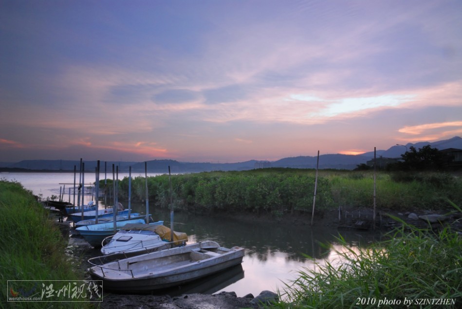 河濱公園看日落風景 在金色的晚霞中小游船靜靜的停靠在小碼頭