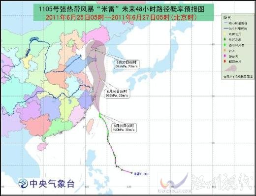 中央氣象臺6月25日06時繼續發布臺風黃色預警:今年第5號強熱帶風暴“米雷”的中心6月25日05時位于浙江省舟山市南偏東方410公里左右的西北太平洋洋面上,就是北緯26.4度、東經123.3度,中心附近最大風力有11級(30米/秒),中心最低氣壓為970百帕。