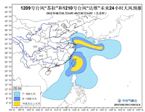 另外,“達維”(damrey)于8月1日08時在日本九州島東南部海面加強為臺風,預計強度還會加強。10時其中心位于山東省日照市東南方大約1330公里的西北太平洋洋面上,北緯30.1度,東經132.2度,中心附近最大風力有12級(33米/秒),中心最低氣壓為975百帕,七級風半徑200公里,10級風半徑80公里。