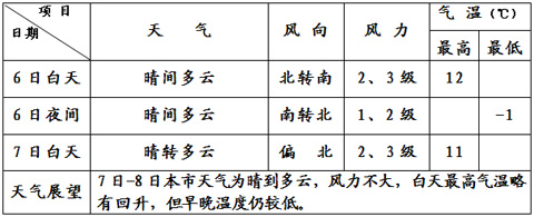 生活提示:6日白天到夜間天氣晴好,風力不大,但早晚氣溫較低,注意防寒保暖。