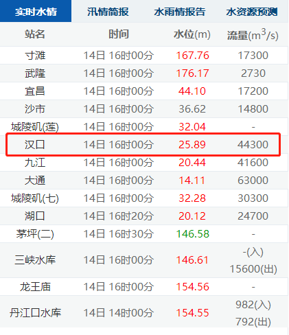 14日16時,漢口武漢關水位已達25.89米,超過25米設防水位0.89米。