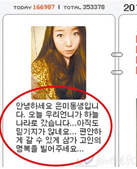 李恩美妹妹在她的博客留言(紅圈處):“不敢相信姐姐已經(jīng)在天堂了!”(圖片來(lái)源:臺(tái)灣蘋(píng)果日?qǐng)?bào))
