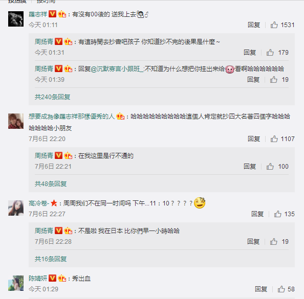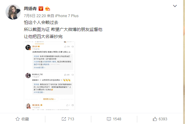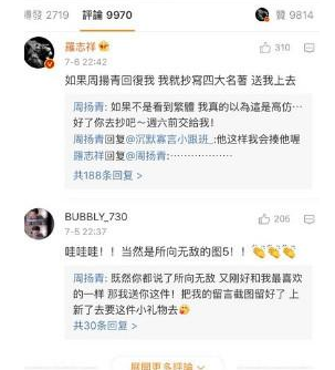 周揚青6日時更新微博:“怕這個人會賴過去,所以截圖為證,希望廣大微博的朋友監督他,讓他把四大名著抄完”,一見附圖是羅志祥在女友貼文下留言,“如果周揚青回復我,我就抄寫四大名著,送我上去”,果不其然網友們馬上就讓該則回復登上熱門留言、火速累積超過300個贊。